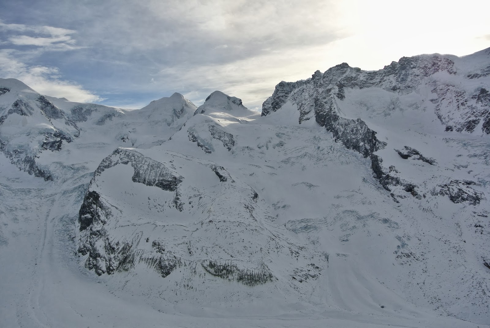Dus is het niet druk en boven gekomen kan ik rustig van het uitzicht genieten.; fraai uitzicht over Italië, de Kleine Matterhorn en de Breithorn ( 4164 m ) http://www.zermatt.ch/de/page.cfm/experience/peaks/matterhorn_glacier_paradise